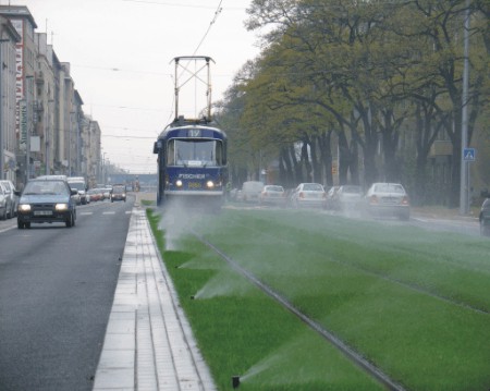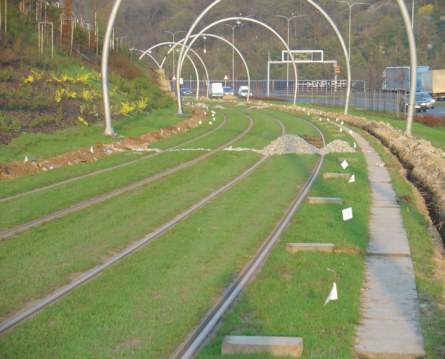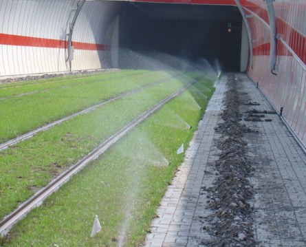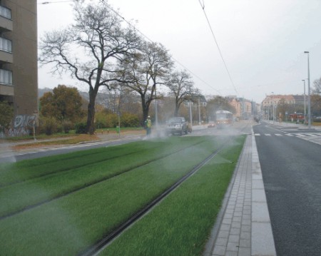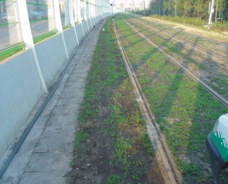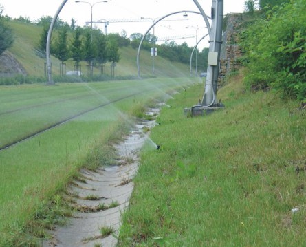 svěže zelená tráva v kolejišti - šedá,suchá v okolí |