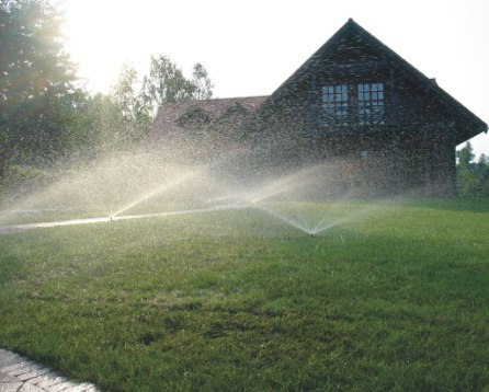 krásný rodinný domek a ještě úžasnější umístění postřikovačů u